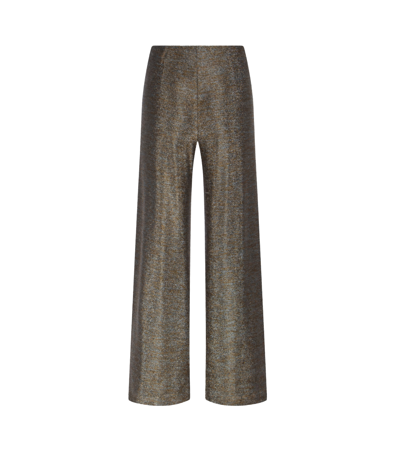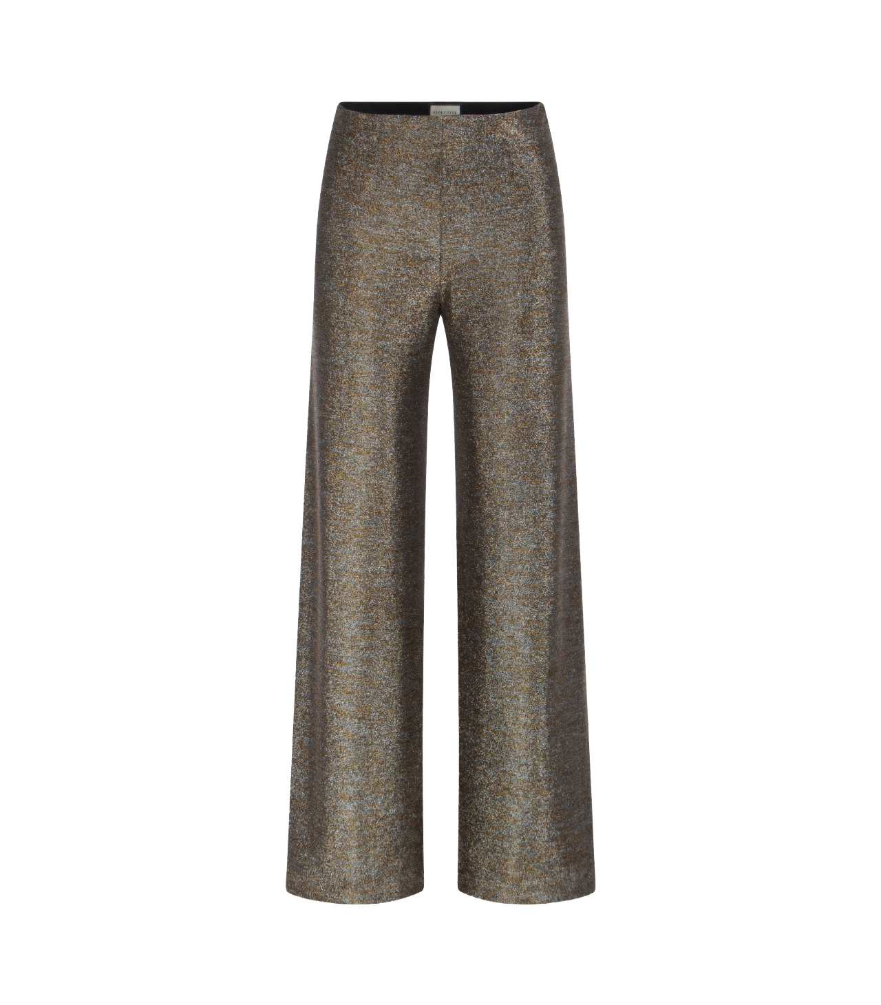 Die Kimberly Hose aus Lurex-Jersey beeindruckt durch ihr weites, verlängertes Bein und einen eleganten High-Waist-Schnitt, der eine schmeichelhafte Silhouette kreiert. Mit Leistentaschen und bi-elastischem Jersey, der durch glänzende Lurexfäden veredelt wird, vereint sie Komfort mit einem Hauch von Glamour.