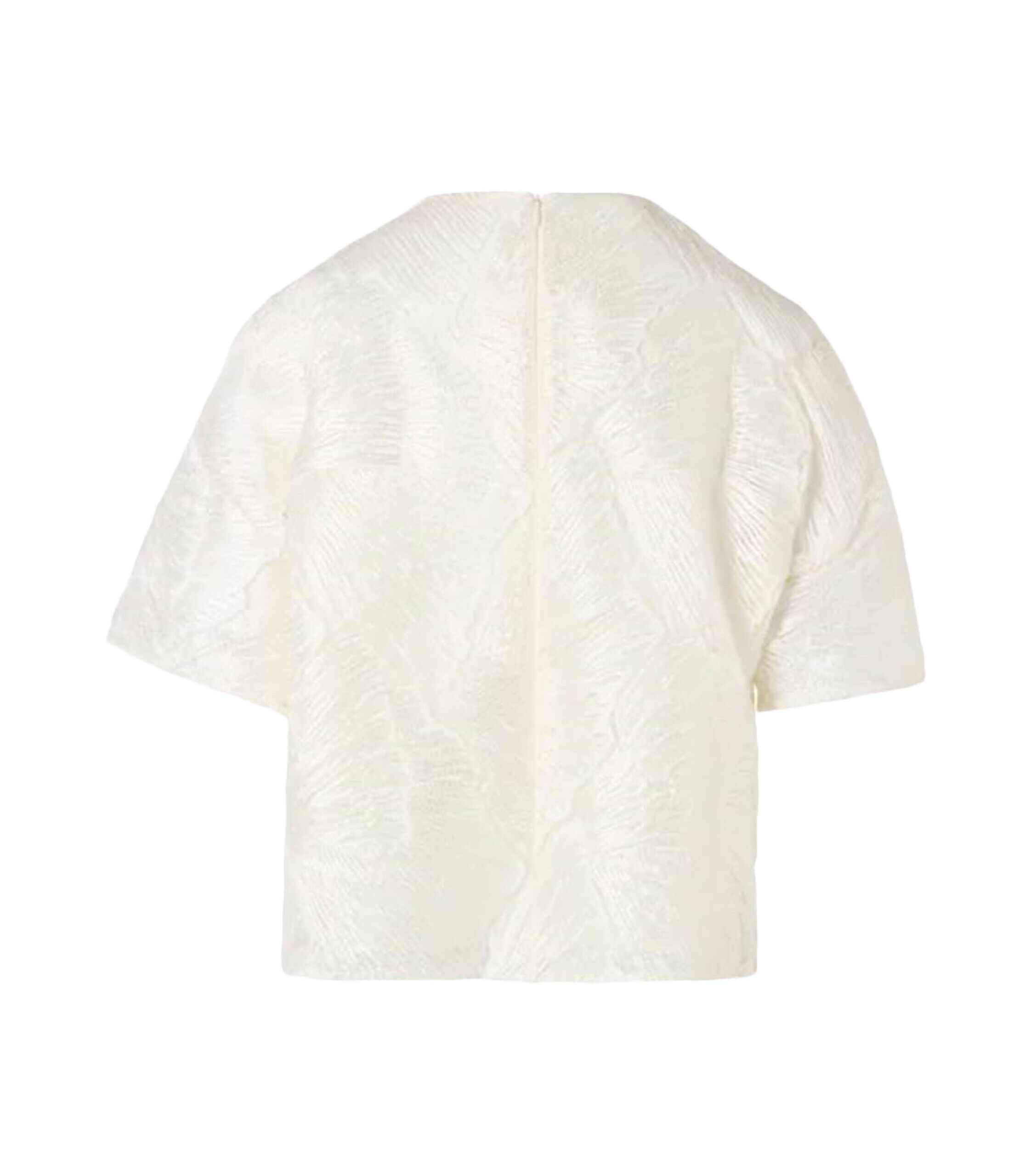 Diese Bluse von Akris ist aus kunstvoller lackierter Fächerspitze gefertigt und besticht durch ihre moderne, boxy Silhouette mit überschnittenen Schultern. Das Design wird durch einen klassischen Rundhalsausschnitt und einen verdeckten Reißverschluss am Rücken abgerundet, was der Bluse eine cleane Optik verleiht. Dank des Viskose-Futters bietet das Modell mit kurzen Ärmeln einen hohen Tragekomfort und kreiert einen skulpturalen Look, der sich mühelos vom Tag bis in den Abend stylen lässt.