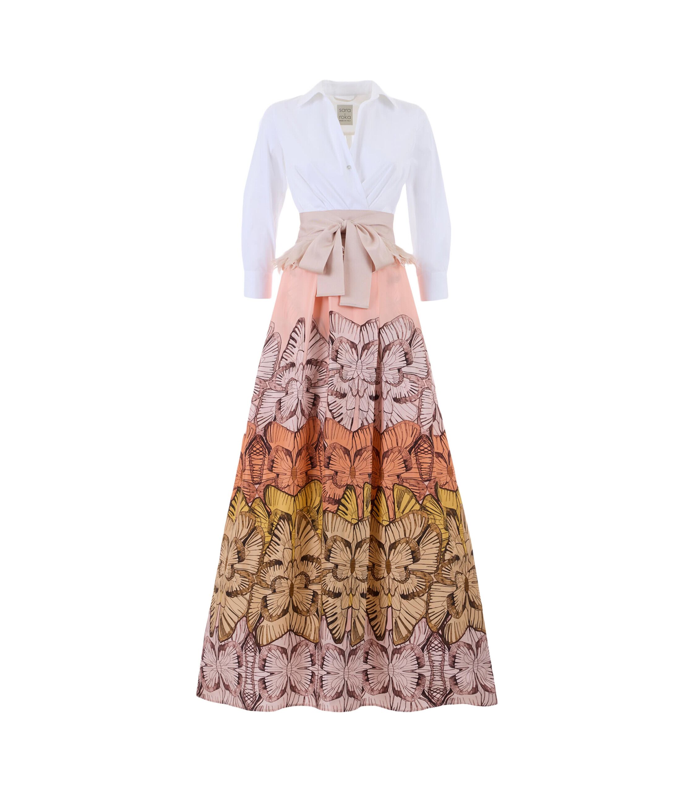 Dieses Kleid von Sara Roka vereint eine elegante Hemdblusen-Optik aus Stretch-Baumwollpopeline mit einem luxuriösen, abnehmbaren Rock aus Seiden-Habutai. Das Modell besticht durch einen kunstvollen, abstrakten Schmetterlingsprint in Nuancen von Blush, Koralle und Ocker auf rosafarbenem Grund. Die feminine Silhouette wird durch einen abnehmbaren Tüll-Unterrock für zusätzliches Volumen sowie einen Ripsband-Gürtel mit edlem Federbesatz perfekt in Szene gesetzt.