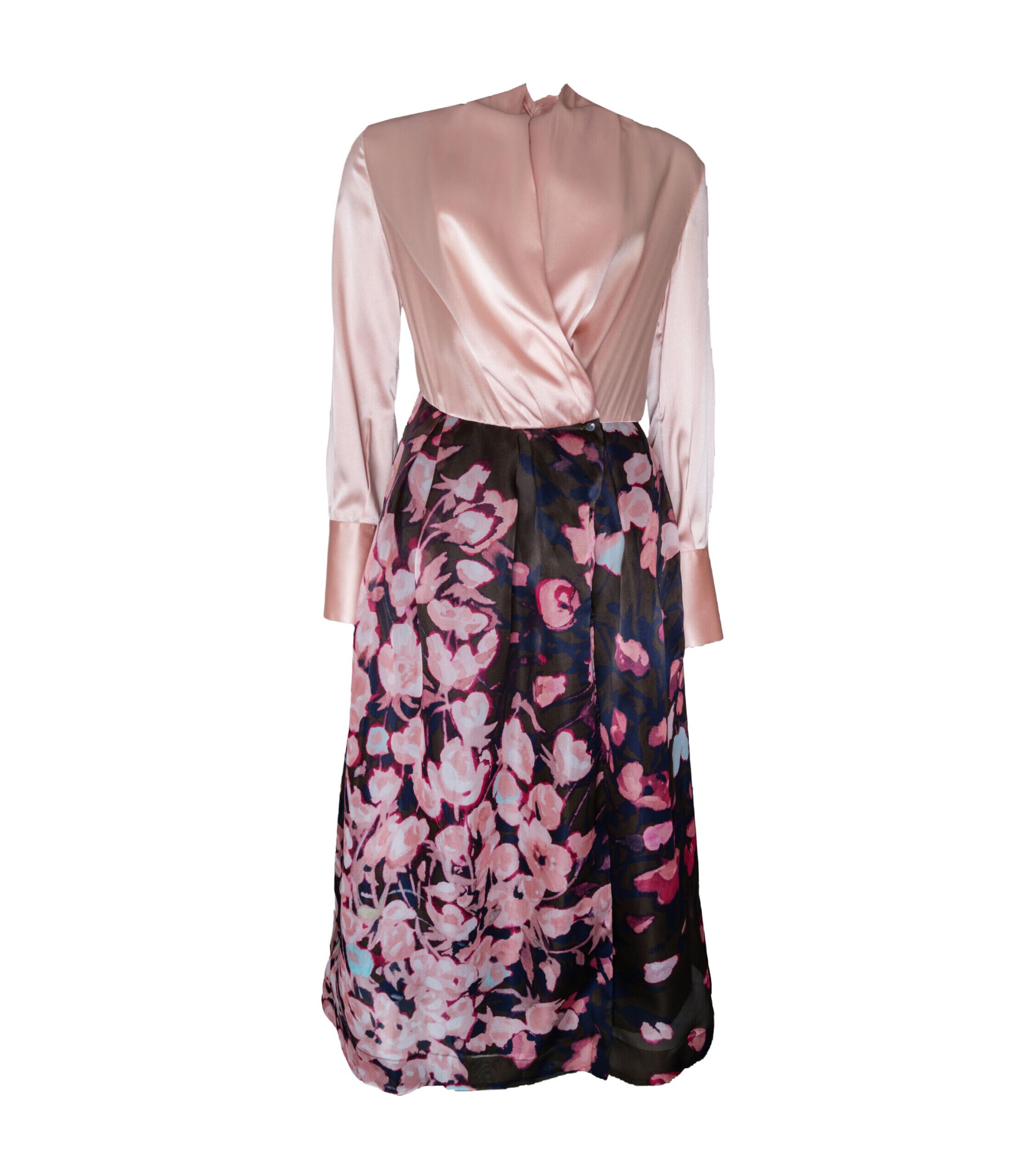 Sara Roka präsentiert ein elegantes Midikleid mit femininer Drapierung und edlem Materialmix. Das fließende Oberteil aus glänzender Seide in zartem Rosé harmoniert perfekt mit dem floralen Rockteil in kräftigen Pink- und Violetttönen – ein Kleid, das Leichtigkeit und Raffinesse vereint.